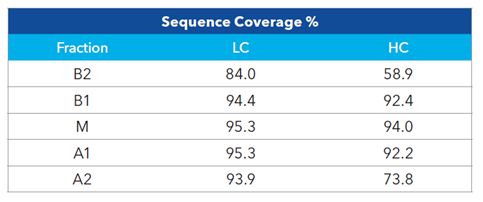 图4 和表2 展示了汇集 10 次后样本的肽图分析结果。结果表明,除了低丰度 B2 (相对丰度0.9%) 和 A2 的重链 (HC) 外,其余电荷变异体的序列覆盖率均在 90% 以上。MauriceFlex™