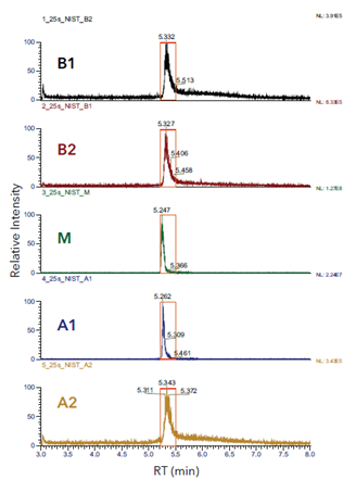 MauriceFlex™组分收集方法可以基于Maurice™ icIEF 分析方法快速建立。使用 Maurice™ 分析型和 MauriceFlex™ 组分收集型卡盒对 NIST mAb 进行 icIEF 分离。我们鉴定了 NIST mAb 的 5 个电荷变异体 (B2、B1、M、A1、A2),并获得了它们的相对丰度 (图1A)。两种图谱显示电荷变异体数量相同。每个变异体的相对丰度 (%) 是根据分析型图谱 (A) 中的峰面积计算的。