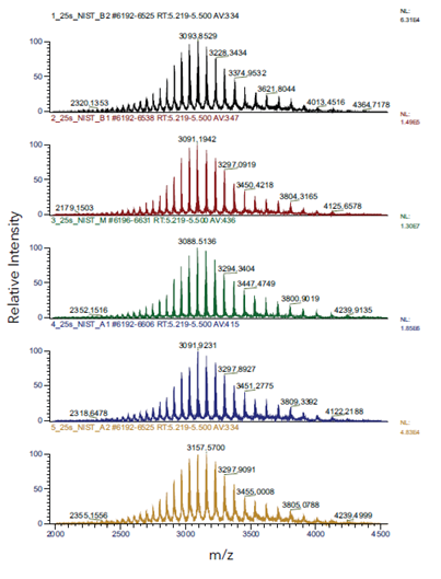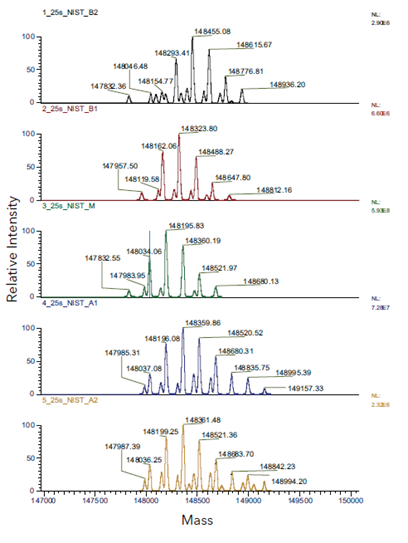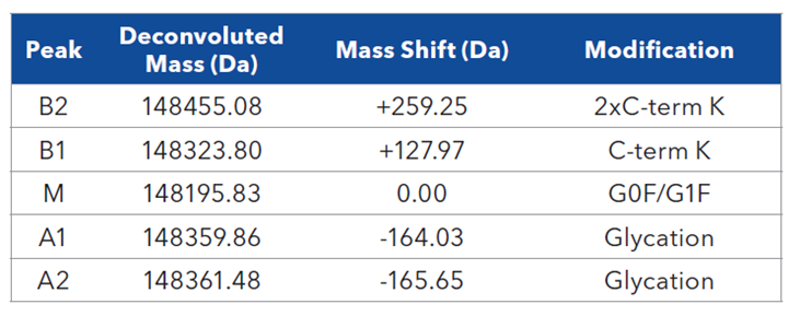 高纯度电荷变异体组分 LC-MS 完整分子量分析如图3所示,从去卷积质谱中鉴定出的每种电荷变异体的修饰如表1所示。鉴定结果与 NIST mAb 电荷变异体已知的修饰情况一致。
