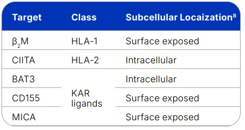 表 1 iPSCs 中的基因敲低靶标。β₂M和CIITA敲除分别抑制HLA-1和HLA-2;BAT3、CD155和MICA为已知KAR配体。CIITA和BAT3为胞内定位,其余为表面暴露靶点。