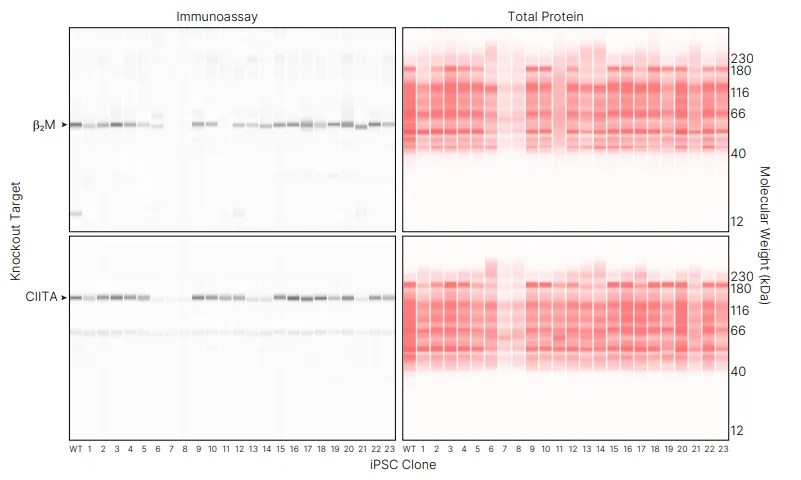 图 1 Simple Western 筛选 iPSCs 中的 HLA 敲除。RePlex™ 模块用于在探针 1(左)中同时检测 β2M 和 CIITA,在探针 2(右)中通过 NIR 检测总蛋白。