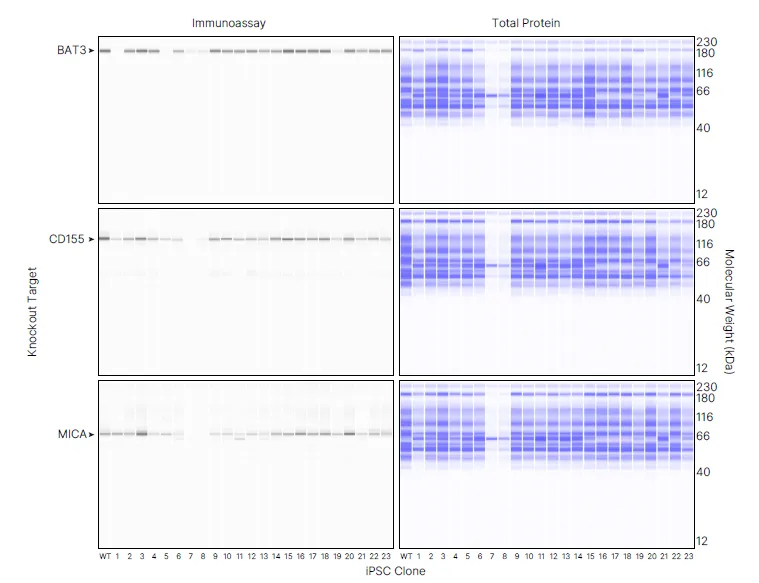 图 2 Simple Western 筛选KAR配体敲除iPSCs克隆。RePlex™ 模块用于在探针 1(左)中同时检测 BAT3、CD155 和 MICA,在探针 2(右)中通过化学发光检测总蛋白。