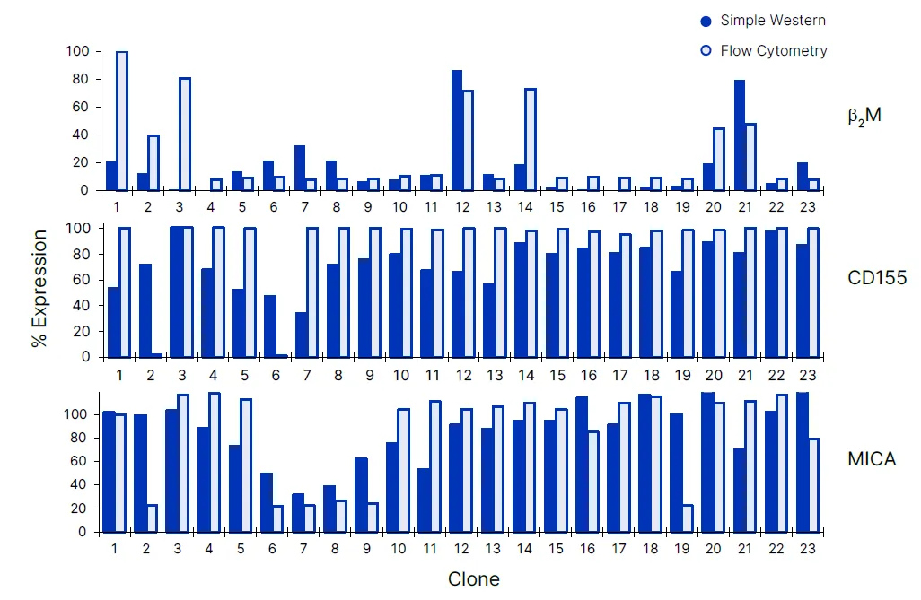 图3 显示的是以野生型为对照,量化各克隆的敲低百分比,并将流式与Simple Western 进行对比。