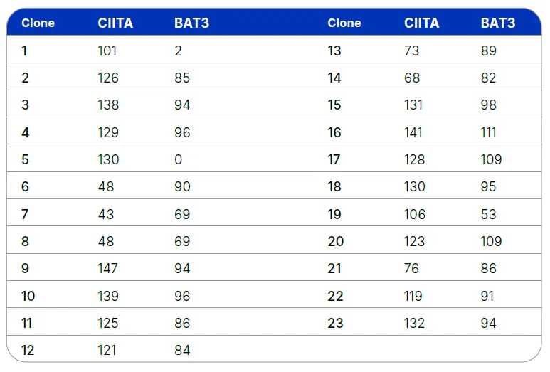 图 3 通过流式及Simple Western敲低靶蛋白的数据对比。数值表示相对于野生型对照的百分比表达量(野生型表达量为100%,完全敲低为0%)。靶点CIITA和BAT3未在流式细胞术数据中展示, 可能是由于它们的细胞内定位导致流式检测结果不可靠。CIITA和BAT3的敲低百分比量化数据改在表4中呈现。