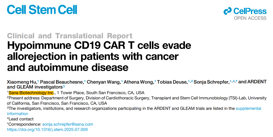 2025年8月13日,Sana 发表题为 “Hypoimmune CD19 CAR T cells evade allorejection in patients with cancer and autoimmune disease” 的临床研究文章于Cell子刊,Cell Stem Cell (IF=20.4)。首次在人体中验证其 HIP (Hypoimmune) 工程化CAR-T (SC291) 可完全逃避免疫排斥,为通用型细胞疗法奠定临床基础。
