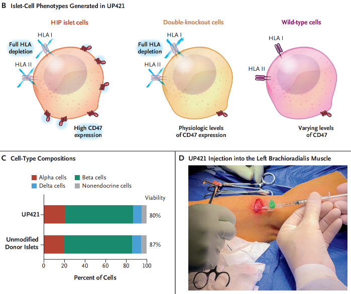 本研究是 Sana 基于HIP平台的UP421管线,首次在人体实现“无需免疫抑制剂”的异体胰岛细胞移植,即在不使用免疫抑制剂的情况下,可成功移植基因编辑的同种异体胰岛β细胞,用于治疗1型糖尿病。