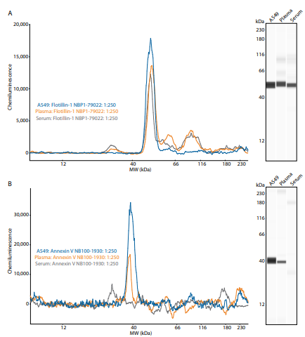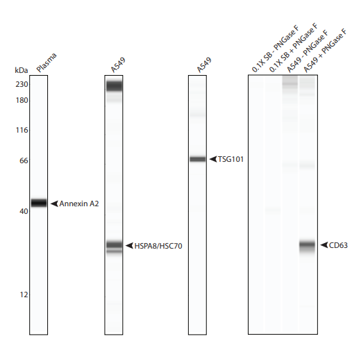 由于外泌体体积微小,从复杂的生物基质中分离外泌体颇具挑战性,且分离产量通常较低。在此背景下,Simple Western™成为研究外泌体的理想技术:该方法仅需 3 微升样品,且具备皮克级灵敏度,大幅减少了传统Western blot对所需外泌体量的要求。随后,可使用针对外泌体相关抗原的特异性检测抗体对之进行表征分析 —— 这些目标抗原既可以是外泌体的通用标志物,也可以是其来源细胞或体液所特有的标志物。本实验方案中,我们将利用市售的外泌体标准品和抗体,通过Simple Western™检测外泌体的通用标志物和来源特异性标志物。