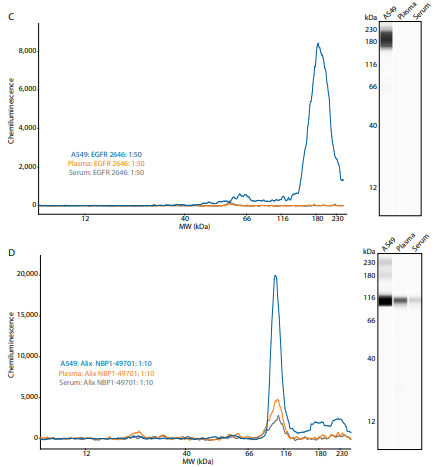 图 1 利用Simple Western™测外泌体目标抗原。A:flotillin-1;B:Annexin V;C:EGFR;D:Alix。