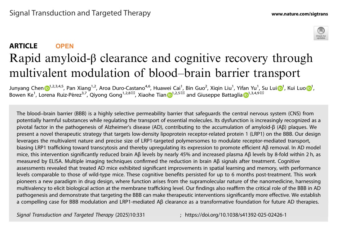 Chen, J., Xiang, P., Duro-Castano, A. et al. Rapid amyloid-β clearance and cognitive recovery through multivalent modulation of blood–brain barrier transport. Sig Transduct Target Ther 10, 331 (2025). https://doi.org/10.1038/s41392-025-02426-1