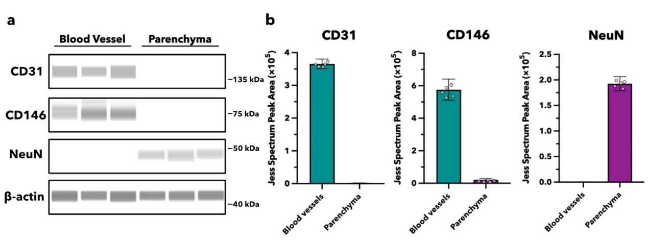 在 AD 病理机制研究中,脑内血管与实质组织的精准分离是解析 BBB 运输功能的前提。研究团队采用葡聚糖密度梯度法分离小鼠脑组织的血管组分与实质组分后,需通过特异性标志物验证分离纯度,以确保后续 Aβ 运输、受体表达等实验数据的准确性 —— 这一关键验证步骤正是通过 Jess 系统完成。