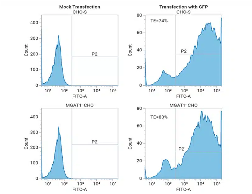 采用 MaxCyte 电穿孔技术转染线性化质粒后,CHO-S 细胞及 MGAT1-CHO 细胞均实现了高效的GFP表达。内容源自O'Rourke等人 (2018) 发表的研究成果,依据知识共享署名4.0国际许可协议 (CC BY 4.0) 使用。