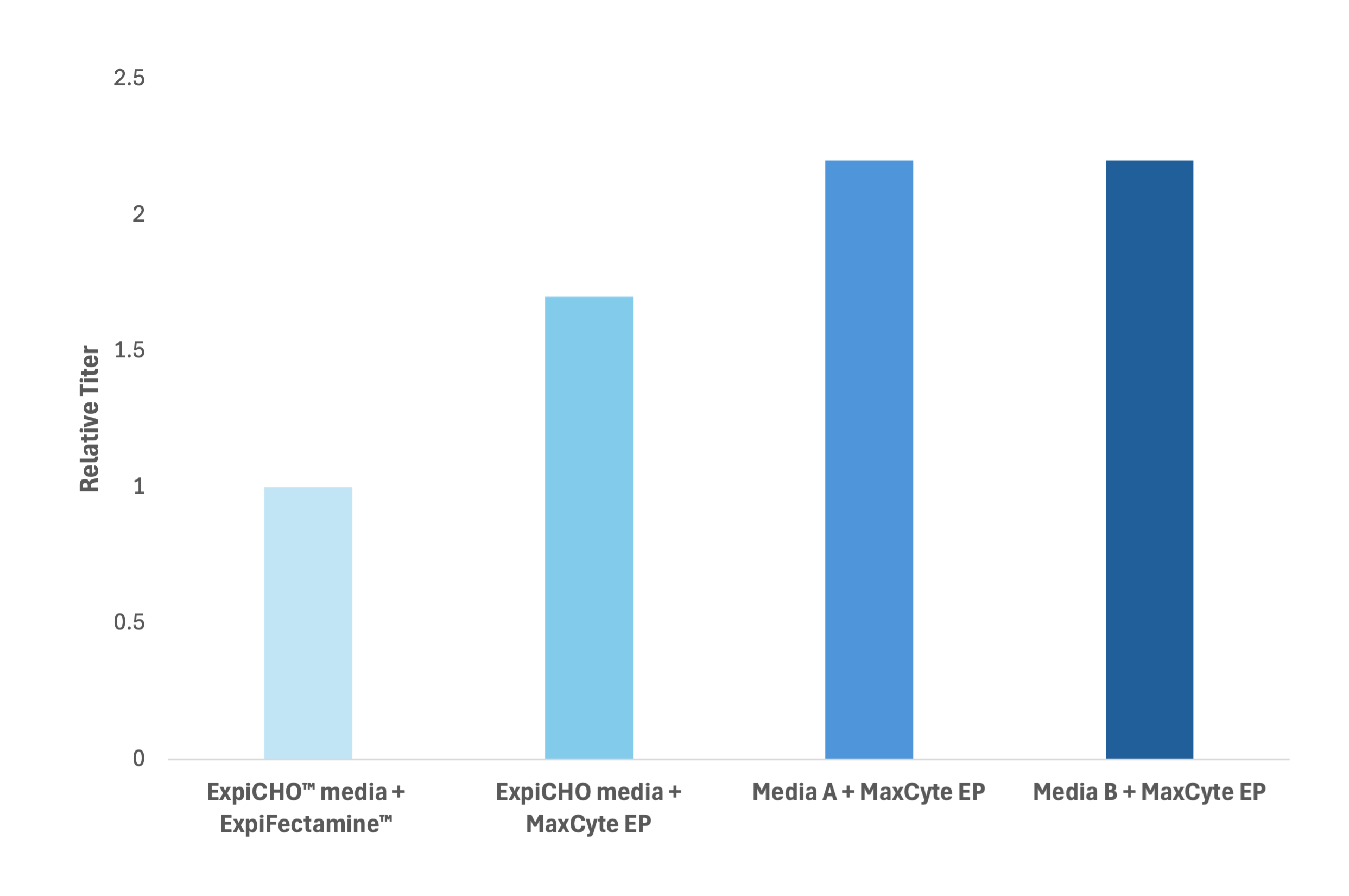 采用 MaxCyte 电穿孔技术在ExpiCHO™系统中已可实现相对较高的抗体滴度,若换用其他培养基,还可进一步提升表达水平。
