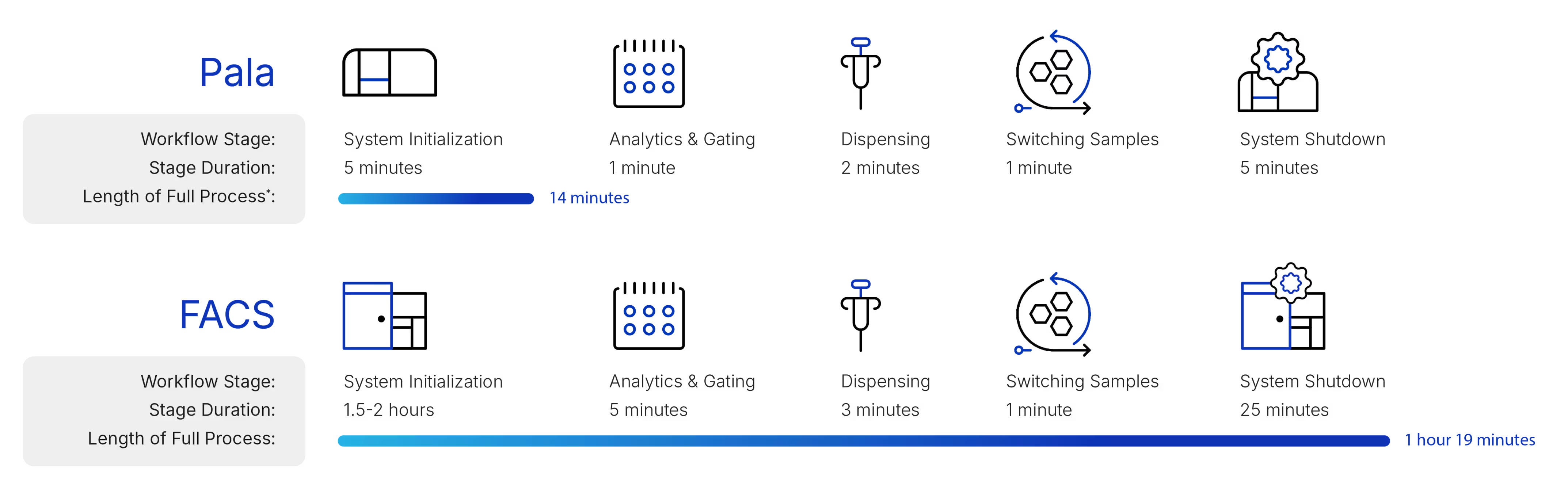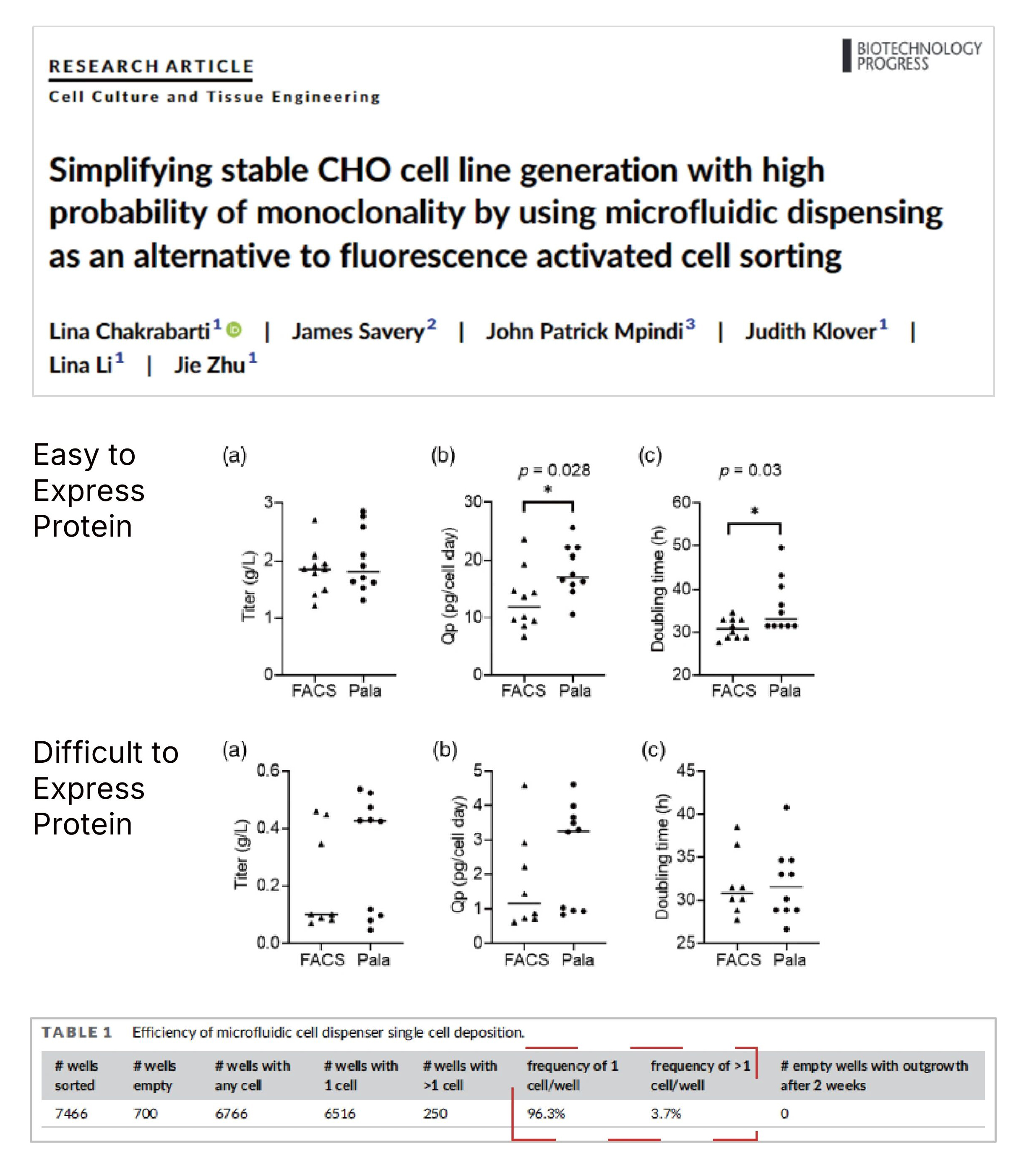 阿斯利康对比了传统FACS与单细胞柔性分选系统Pala,结果表明与FACS衍生细胞系相比,Pala具有相当甚至更优的细胞生长和生产能力,且操作简单,运行/维护成本低,可以作为替代FACS更具性价比,高效便捷的选择。