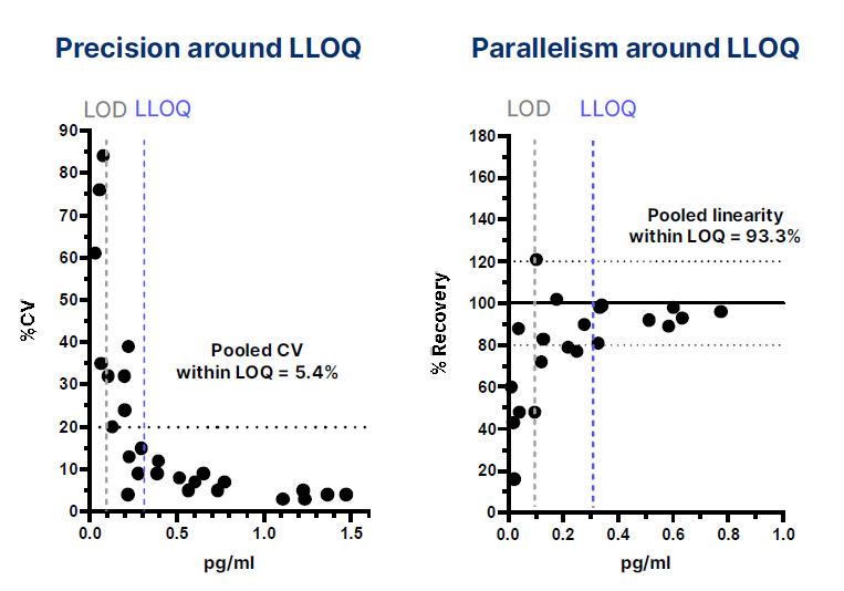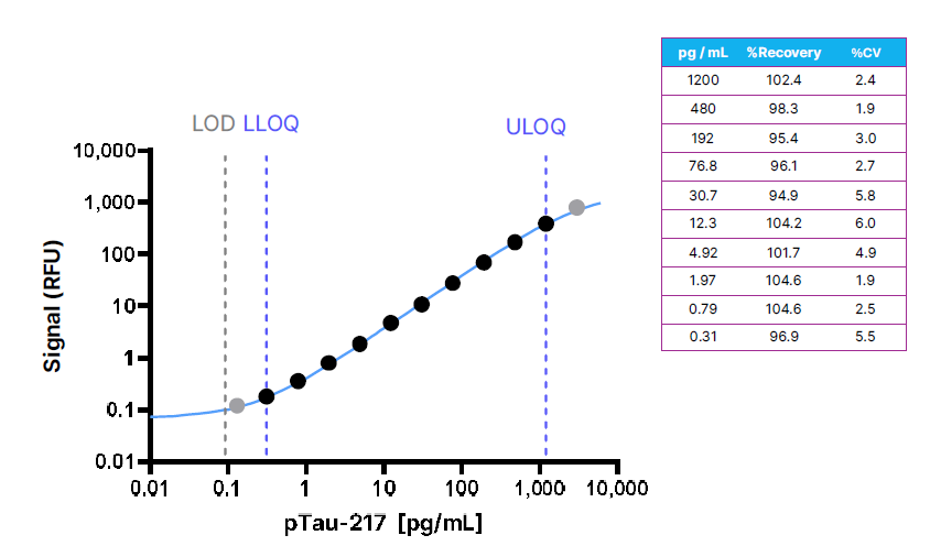 通过对含有 pTau - 217的血浆样本进行系列稀释,样本中抗原水平分别高于和低于定量下限 (LLOQ) 阈值,从而对定量下限进行进一步确认。结果显示,在定量限范围内的所有样本,回收率均在 80% 至 120% 之间,变异系数 (CV) ≤20% 。