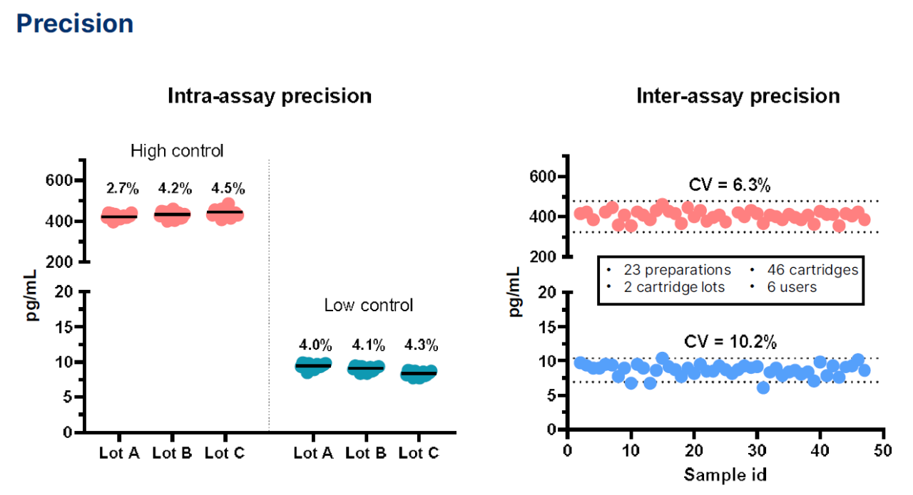 左图:将低浓度和高浓度的对照样本在三个不同批次的Ella卡盒中重复检测 (n=6) 。结果显示,批间变异系数CV均 ≤5%,该检测平台的批内精确度高。右图:由多名操作人员使用2个批次多个检测卡盒以及多台Ella分析仪,对高浓度 (红色) 和低浓度 (蓝色) 的对照样本进行制备和检测。结果显示,批间精确度高 (变异系数 CV≤12%) 。