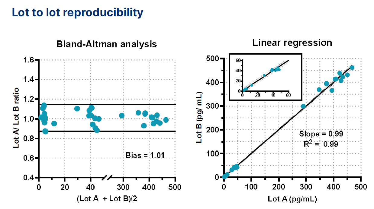 通过在两个独立批次的卡盒上运行检测浓度值在检测范围内的不同样本,来评估卡盒批次间的重现性。结果表明,通过Bland-Altman分析 (左图) 和线性回归分析 (右图) ,不同批次卡盒的检测浓度值具有可接受的等效性。