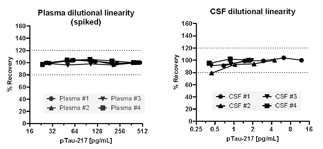 图5. 血浆和CSF样本线性稀释回收