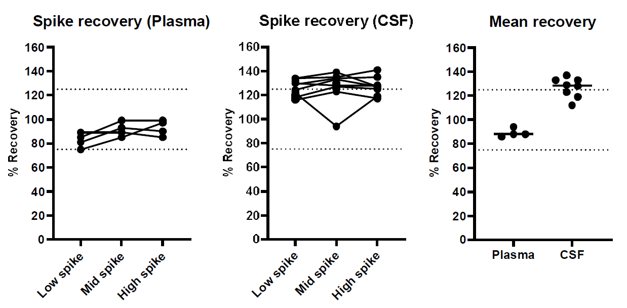所有血浆和脑脊液样本均表现出良好的线性回收,平均回收率均在80%到120%之间 (血浆的平均回收率为100%,脑脊液的平均回收率为94%) 。