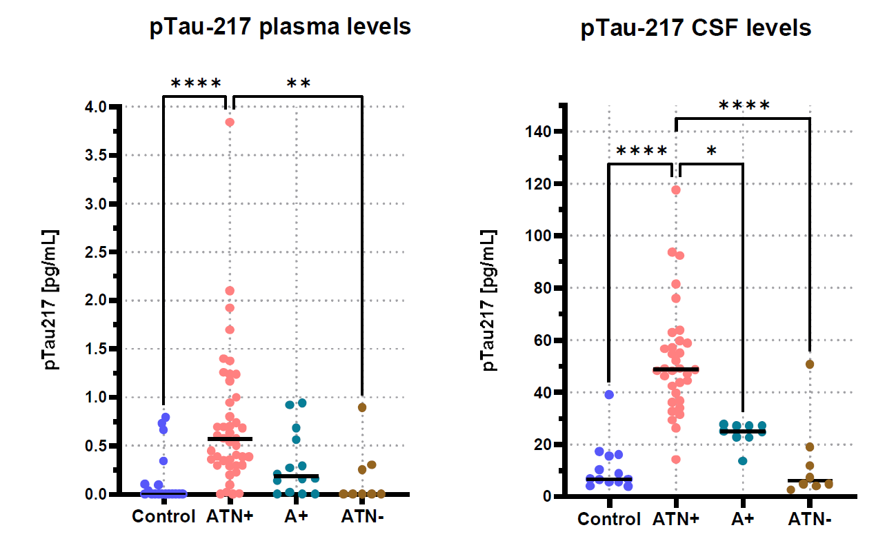 血浆 (左侧) 和脑脊液 (右侧) 中的pTau-217水平在健康供体与临床诊断的阿尔茨海默病患者之间进行了比较。与健康对照组及ATN阴性患者相比,ATN阳性患者 (ATN+) 在血浆和脑脊液中的pTau-217显著升高。在比较ATN+和淀粉样蛋白阳性 (A+) 患者组时,也发现了脑脊液pTau水平的显著差异。统计分析使用了Kruskal-Wallis检验,随后进行了Dunn’s多重比较事后检验。