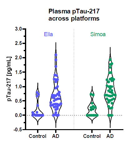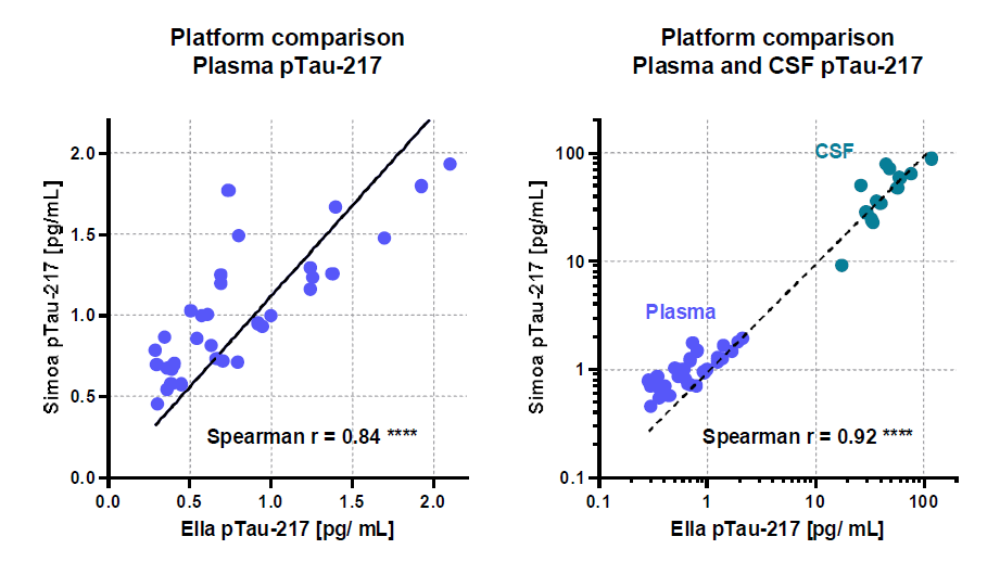 图8. Ella平台与Simoa平台平行评估血浆中pTau-217含量