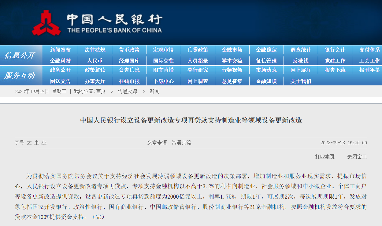 9月28日,政策火速落地,央行宣布设立设备更新改造专项再贷款,额度2000亿元以上,利率1.75%,支持金融机构以不高于3.2%的利率向制造业、社会服务领域和中小微企业、个体工商户等设备更新改造提供贷款,涉及教育、卫生健康、文旅体育、新型基础设施等10个领域。
