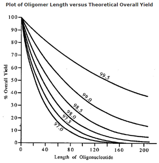 例如,合成平均偶联效率为99%的30 mer寡核苷酸(29个偶联步骤),理论上可得75%产量(0.9929)。然而,若以98%的效率进行相同的合成,最大合成终产量仅为56%。而在实践中,即使偶联效率为99%,所能期望的最高合成终产量也仅为50%。在偶联效率为98%时,合成终产量甚至低达25%。