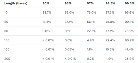 在每个合成周期中(each cycle of synthesis),化学或物理因素的限制使得偶联效率无法达到100%,因为即便使用精细的化学合成试剂,总会有一些 support-bound 寡核苷酸不会偶联。由此,每个合成周期都会产生小于百分比 n-1 产物(<1%),并会逐步积累。随着序列长度的增加,n-1 产物的总百分比也会增加。99.4%偶联效率的20 mer寡核苷酸预估产量为89.2% FLP(full-length product),而具有相同偶联效率的50 mer寡核苷酸预估产量为74.5% FLP。寡核苷酸长度、偶联效率和FLP百分比之间的关系参看下图。