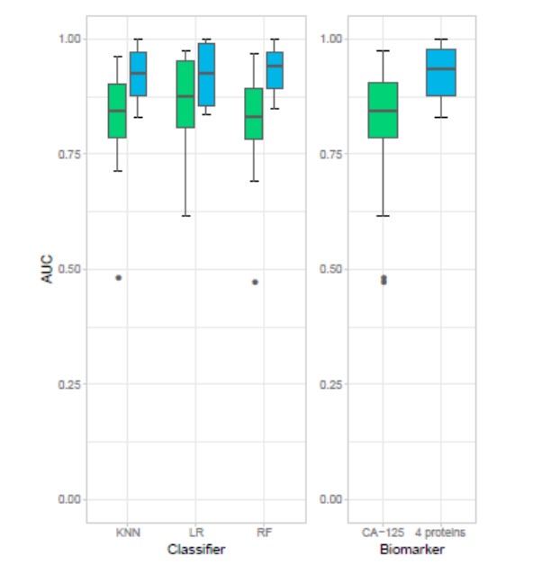 耶鲁大学医学院科学家,利用 Ella 平台研究卵巢癌 病人早期预测标志物,通过筛选 IL-1Ra,IL-6,Dkk-1, uPA,E-CAD、ErbB2,SLPI,HE4,CA125,LCN2, MSLN 和 OPN 多个蛋白标志物,发现 CA125, HE4, E-CAD 和 IL-6 构成的 4 因子组合比 CA125 和 HE4 2 因子组合 更有优势,可作为预测早期卵巢癌的肿瘤标志物。(C. Han,Gynecologic Oncology,2018)