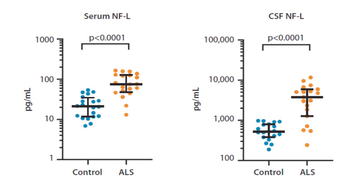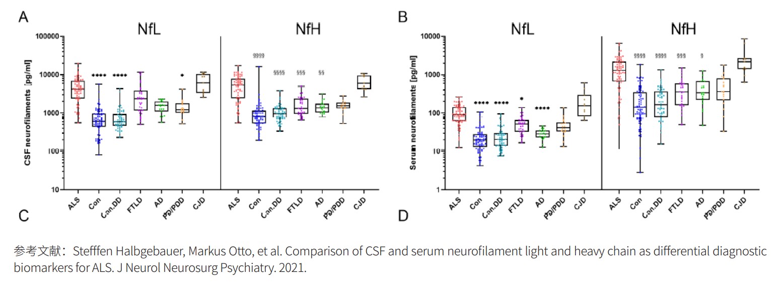 德国乌尔姆大学 Markus Otto 教授团队在 ALS 和其他神经系统疾病的大型人群队列研究中,利用 Ella 系统检 测血清和脑脊液中 NfL/NfH。NfL 和 NfH 定量动态范围分别为 2.7-10,290 pg/mL 和 7.46-28,480 pg/mL。样本浓度 中值如下:脑脊液 NfL 为 2799 pg/mL 和 NfH 3011 pg/mL;血液 NfL 为 11.5 pg/mL 和 NfH 56.5 pg/mL。与对照 相比,脑脊液和血清中 NfL 和 NfH 在 ALS 病人中显示出明显增加,都适合作为 ALS 的鉴别诊断标志物,但血清中 NfH 的效力似乎略低。本研究与 Audrey Gauthier 等(Annuals of Clinical and Translational Neurology, 2021)结 果证明了 Ella 具有快速、高灵敏、高性价比和稳定特性,适合作为神经退行性疾病生物标志物常规实验室检测使用。