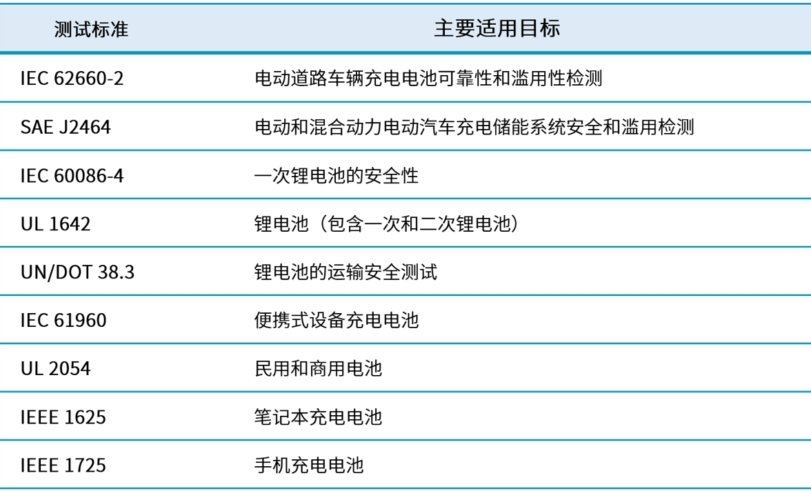为了尽可能降低锂电池在使用过程中可能面临的安全风险,测试人员会在电池研发和生产阶段进行一系列电池测试。这些测试的主要目的在于确保电池在各种极端与常规环境下均能稳定运行并维持高度安全性,这一过程通常是借助高精度测试箱模拟电池的实际工作环境来实现的。遵循IEC、SAE、UL、UN等国际权威组织的行业标准,一系列严格的测试被逐一执行,涵盖热滥用、耐热性、温度循环以及热短路等测试,以全面评估电池的性能与安全性。