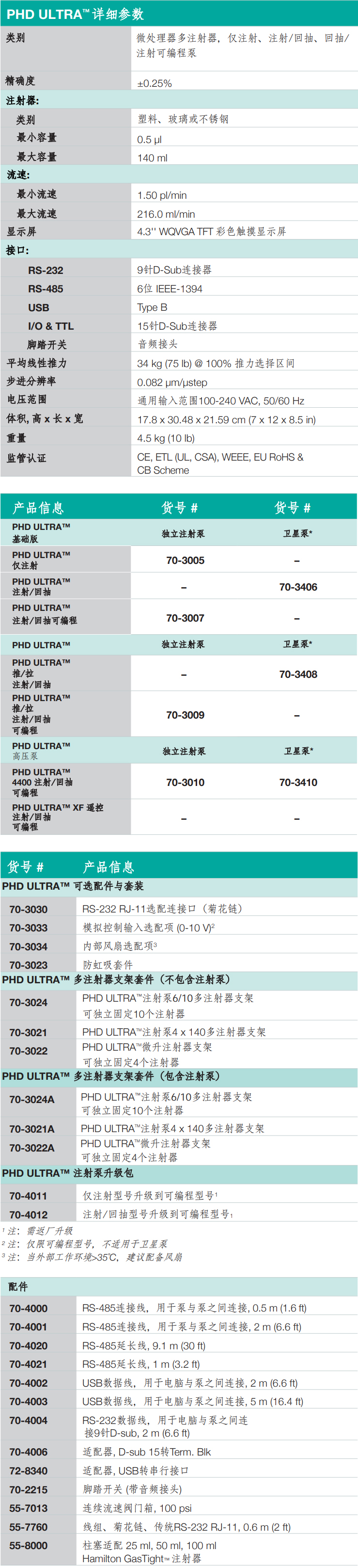 — 连接方式:适配 USB 或 RS-232 计算机控制;RS-485 或可选用于菊花链的 RJ-11 (可控制多个泵)。