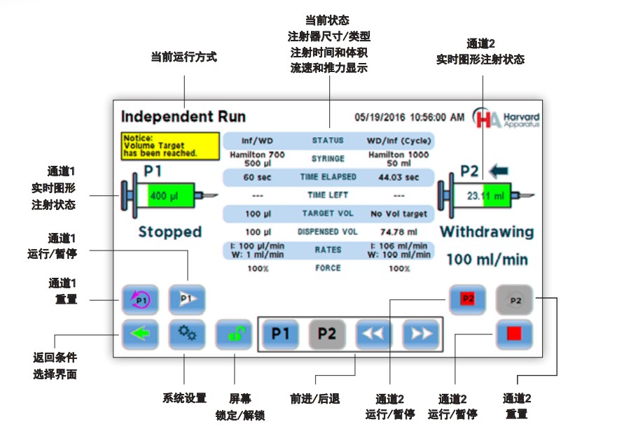 独立运行模式可以让Pump 33 DDS像两台独立的注射泵一样运行,系统中以P1和P2来命名。每一台泵都可以独立运行,并可安装不同类型和尺寸的注射器、设定不同的推力和目标(体积或时间)。