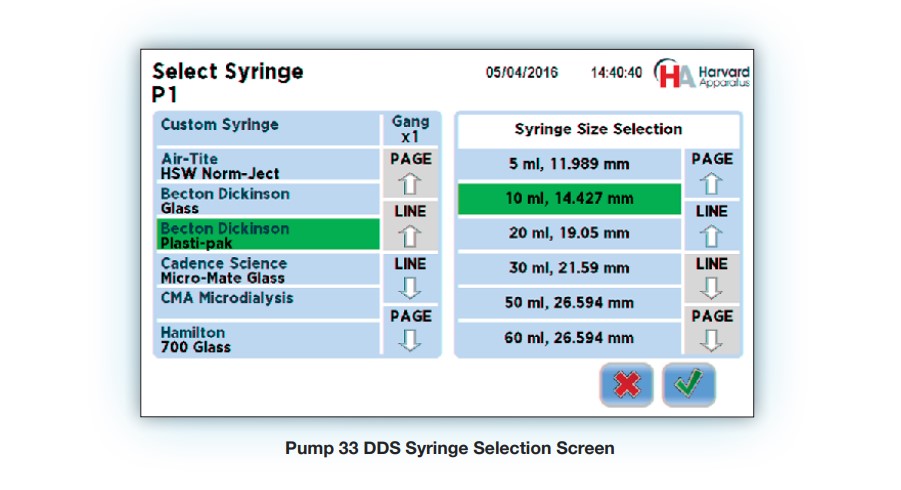 Pump 33 DDS直观的图形用户界面通过一个7英寸LCD彩色触摸屏控制,用户可以快速并简便地设定注射程序。彩色触摸屏可以实时地显示您的所有关键参数设置。注射器平台可以固定所有主要的注射器品牌,几乎所有不同尺寸的注射器。提示声、可调推力、屏幕锁定等都可在触摸屏上来进行设定。