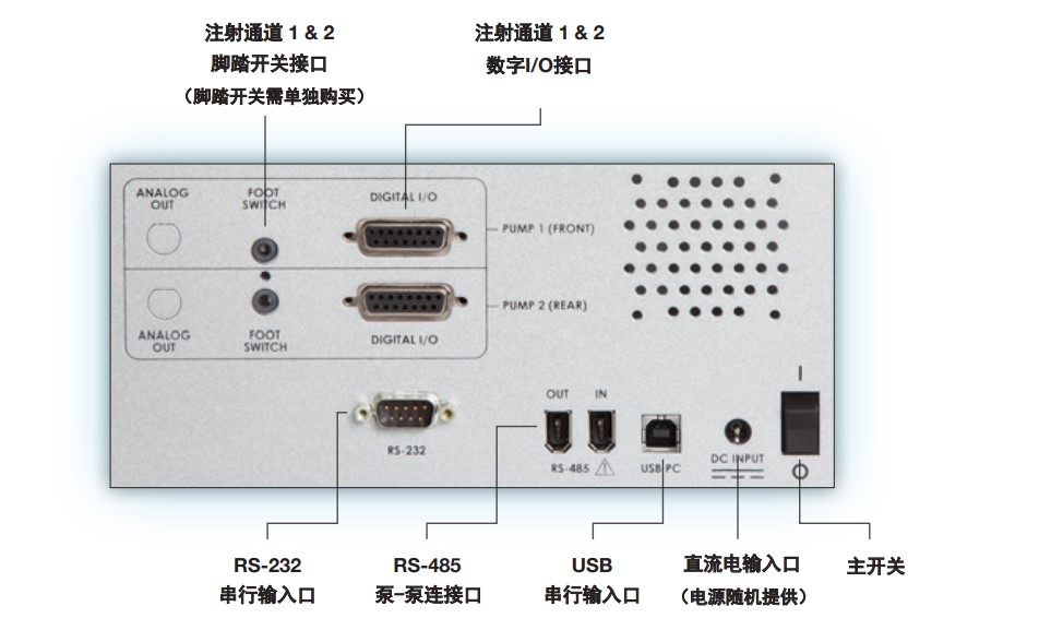 Pump 33 DDS 标配用于电脑连接的USB和RS-232连接线,以及用于泵与泵之间连接的RS-485连接线。整个ASCII命令套组都可以用来电脑远程控制注射泵。每个独立的注射通道还标配有一个脚踏开关的输入接口,一个数字VO接口。
