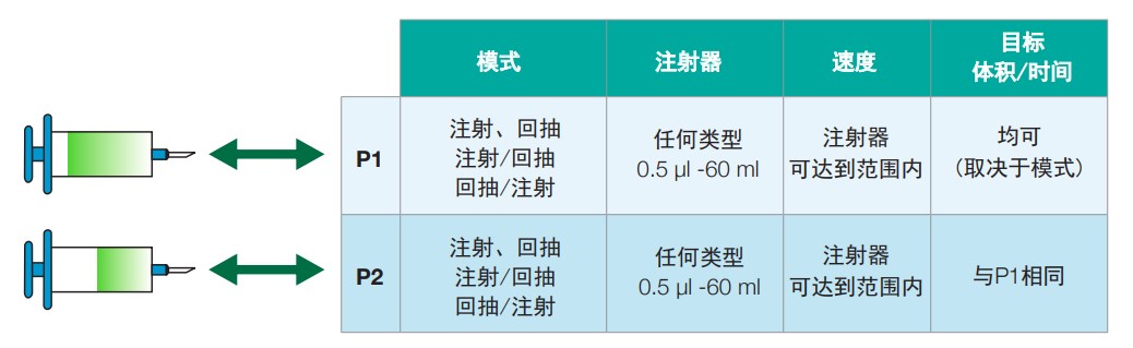 • 平稳的流速控制,最小可达1.02 pl/min(取决于注射器)