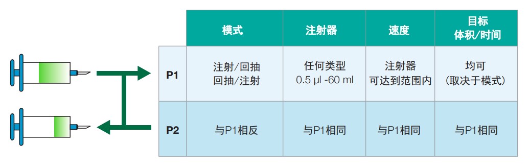 在往复运行方式下,两个通道使用相同的尺寸和类型的注射器,以同样的速度向相反的方向运行。当与阀门箱同时使用时,往复方式可以提供像蠕动泵一样的连续流体输送,并且比蠕动泵更加准确,无蠕动脉冲,同时可以提供更加低速的输送速度。