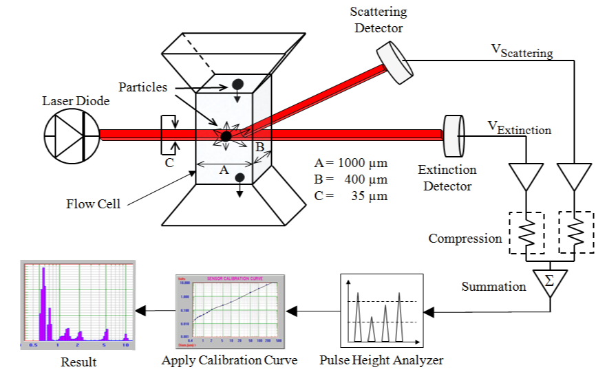SPOS对粒子的信号响应方式是信号与特定粒子应的。AccuSizer 780系列仪器中的传感器通过两种不同性质的物理作用:光消减(light extinction, LE)与光散射(light scattering, LS)对通过传感器的粒子进行测定。光消减检测通过流动池的光强变化,拥有检测粒子的粒径范围广且与粒子组份无关等优点。然而,它的灵敏度有限。另一方面,光散射窄的动态粒径范围 (取决于检测器/放大器的饱和值),但能检测到小粒径的粒子,使用大功率激光光源还能检测到粒径更小的粒子。通过合并光消减和光散射响应信号,传感器可同时拥有这两种方法的优点,因而在不损失单粒子分辨率巨大优势的前提下拥有较广的动态粒径范围。