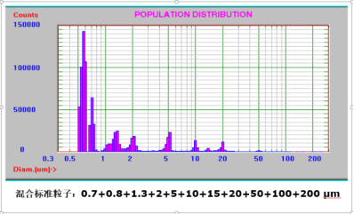 如图1所示,同一个样本中混合0.7μm0.8μm1.3μm2μm5μm10μm15μm20μm50μm100μm200μm 11种标准PSL粒子,SPOS可以很容易将每种不同大小的标粒区分清楚。
