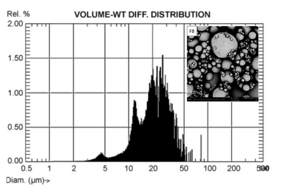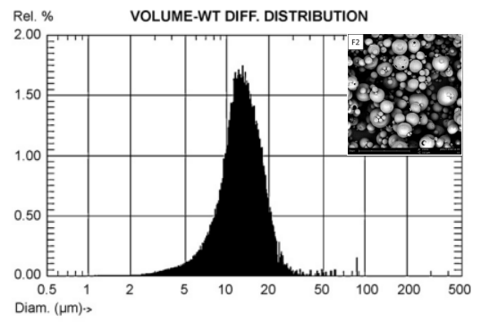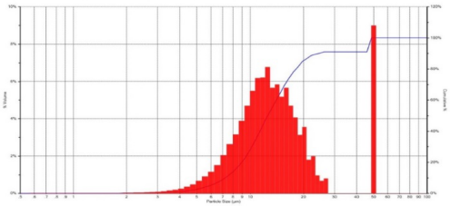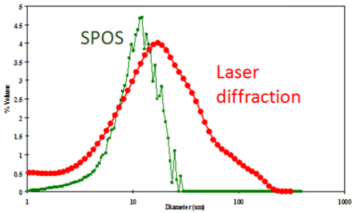2展示了同一个样本在SPOS和激光衍射法(Laser diffractionLD)粒度仪中测得的结果。样本使用的是过400目筛(37μm)的样本。SPOS(绿色线)显示在35μm以上是没有粒子的,这和实际情况相符。但是使用LD检测得到的仅仅是“相似”的分布,但是在100μm本来没有颗粒的情况下却给出了还有大颗粒的假性结果。