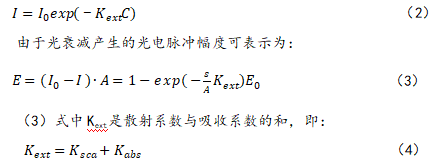 当光束照射含有悬浮微粒的液体时光能减弱。根据文献, 此时悬浮液中微粒会对光产生散射和吸收等作用,因为这些作用导致的光强减弱与微粒的浓度存在线性关系。在文献中引用了如下公式,来描述当微粒浓度较小时,透射光强与入射光强之间的关系:
