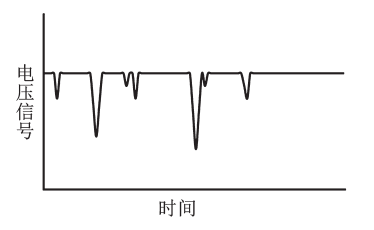 1为光阻法检测原理图,待测液体流过横截面很小的流通池,流通池两侧装有光学玻璃,激光器的光束通过透镜组准直,光束穿过流通池并被光电探测器所接收。若待测液体中没有颗粒,则光电探测器接收到的光信号稳定不变,输出的电压信号也恒定,将此恒定信号作为基准电压;若液体中有颗粒物质,颗粒通过流通池传感区域,将会遮挡激光,光电探测器接收到的光信号减小,产生一个负的脉冲电信号,如下图2所示。