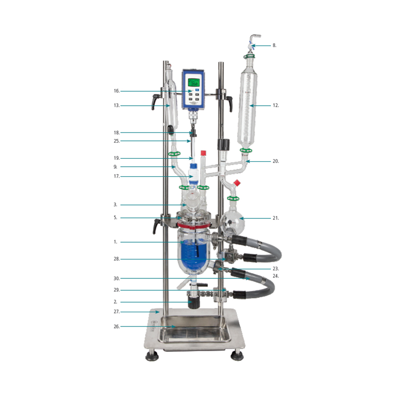 新型桌上式玻璃反应系统,套装包含: 玻璃单元,搅拌单元和整体支架。