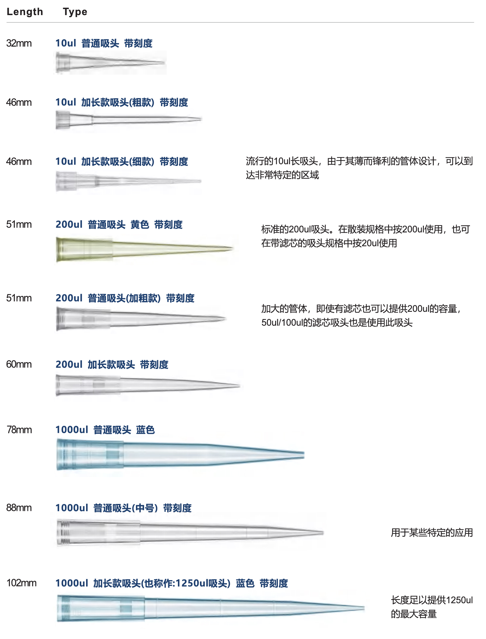 100-1,200 µL,带刻度,PP,盒装,加长款(102mm),无DNase/RNase, endotoxin,灭菌