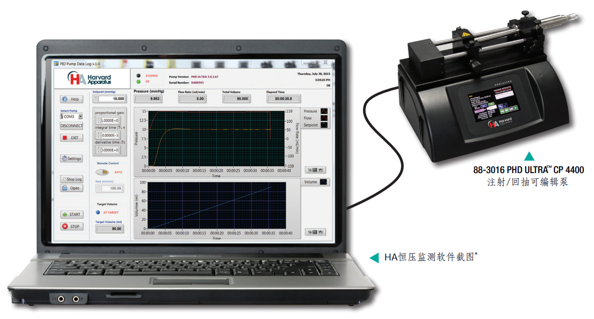可通过连接 PHD ULTRA™ CP 与电脑的 RS-232 数据线监控数据。在实际操作中,压力传感器放大器的 0-10 V 模拟输出口是与泵背后面板上的模拟输入口相连接。该放大器或信号调节器可以由用户提供或用通过 HA 的传感器和放大器来实现。对于输出小于 10 V 的系统,可缩放压力范围,适应可用的传感器电压输出。在恒压模式下,除了设定压力和实际压力外,泵还可显示流速。该数据可以被输出,并利用数据采集包进行进一步分析。