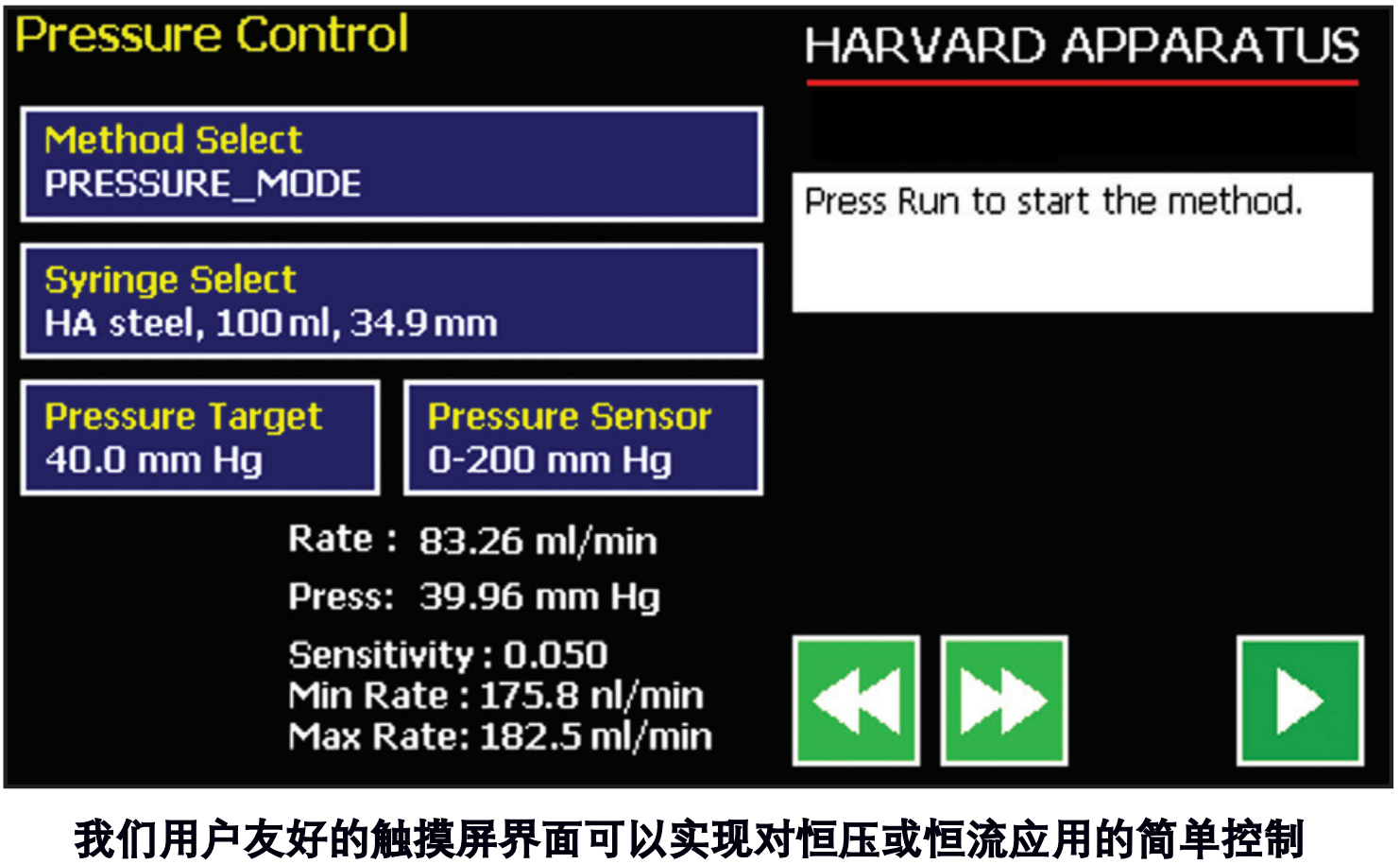 灵敏度设置允许用户自行调节,能够定制达到设定压力所需的系统响应时间。 PHD ULTRATM CP 注射泵允许用户以自己选择的单位设置压力,包括 mmHg 、kPa 和 psi 。