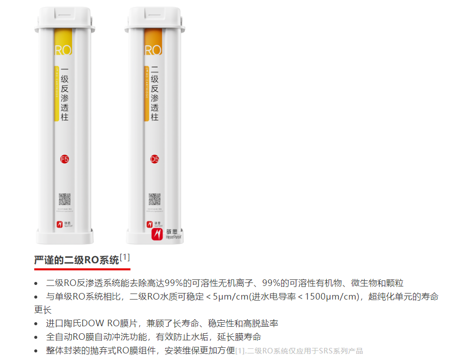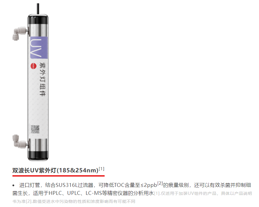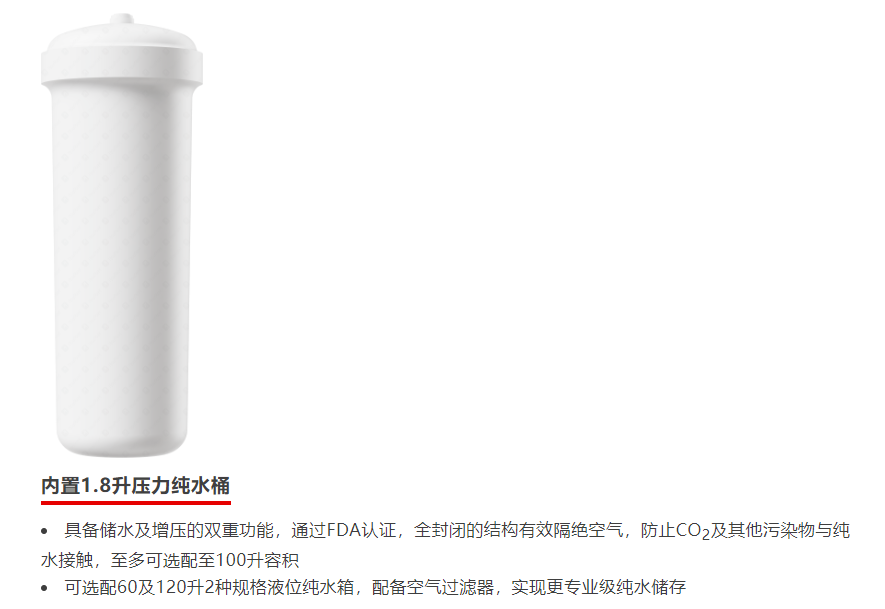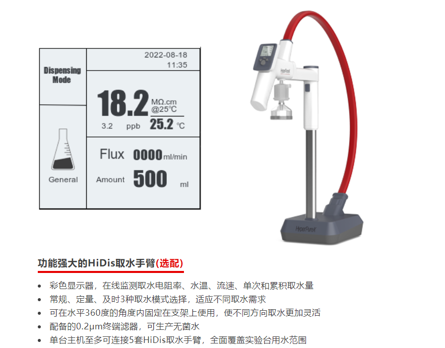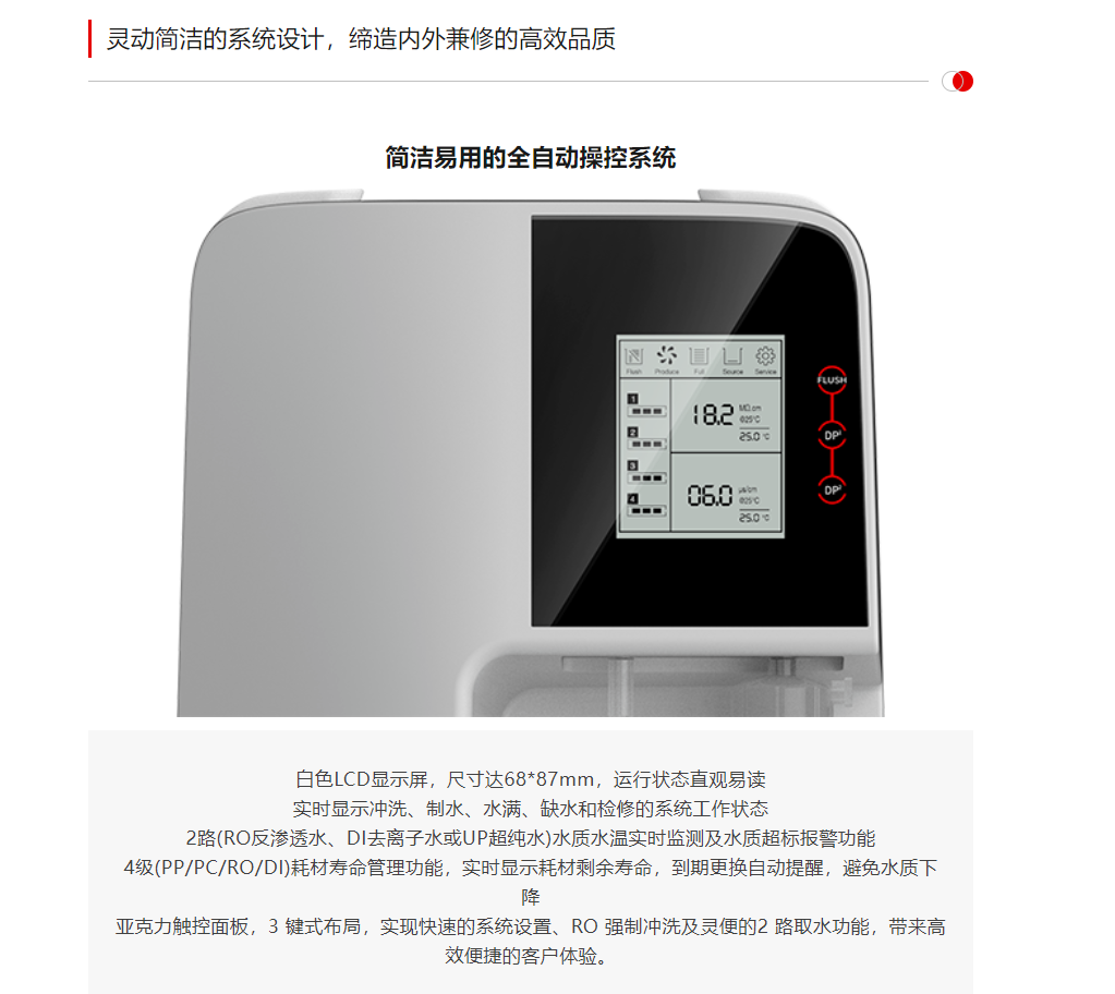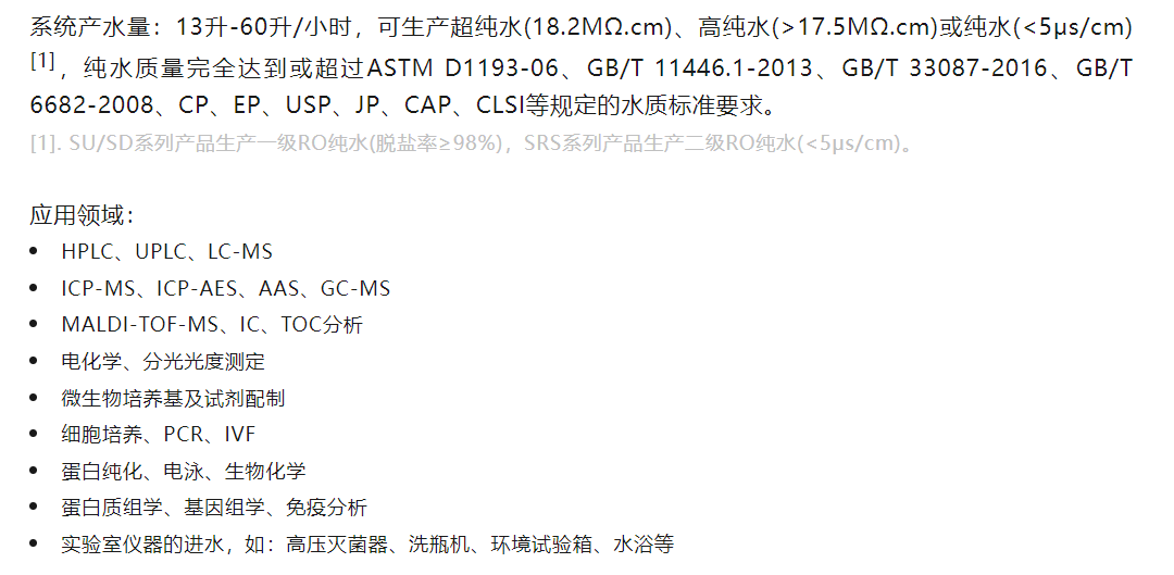 采用创新开发的全自动控制系统及LCD显示屏,内嵌新型纯化柱,集成专业稳定的高脱盐率RO系统和大容量的DI离子交换纯化单元,更具经济性和性价比,是实验室用水的经济选择。系统产水量:13升-60升/小时,可生产超纯水(18.2MΩ.cm)、高纯水(>17.5MΩ.cm)或纯水(<5μs/cm),纯水质量完全达到或超过ASTM D1193-06、GB/T 11446.1-2013、GB/T 33087-2016、GB/T 6682-2008、CP、EP、USP、JP、CAP、CLSI等规定的水质标准要求。
