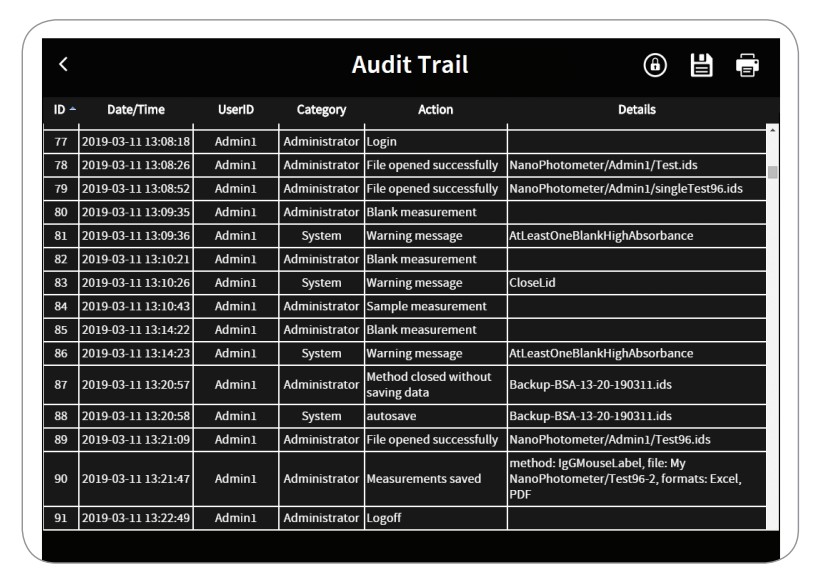 测量的数据通过确认的用户ID和密码保存。保存的文件中提供了用户名,用户ID,日期和时间做为适当的电子记录保存。不能更改的IDS和PDF文件确保了数据完整性。