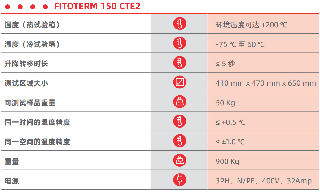 高低温冲击试验箱 FitoTerm 150CTE2 在同一底座上有两个独立的试验箱上层(热)试验箱通过电加热器和空气循环加热,可达到 200C 的均匀温度;下层(冷)试验箱通过动态通风 +/-2 m/s,达到均匀化和温度均一性温度可降低至-75°C。